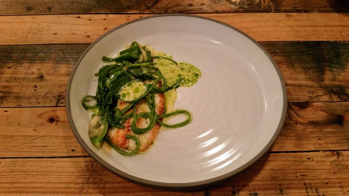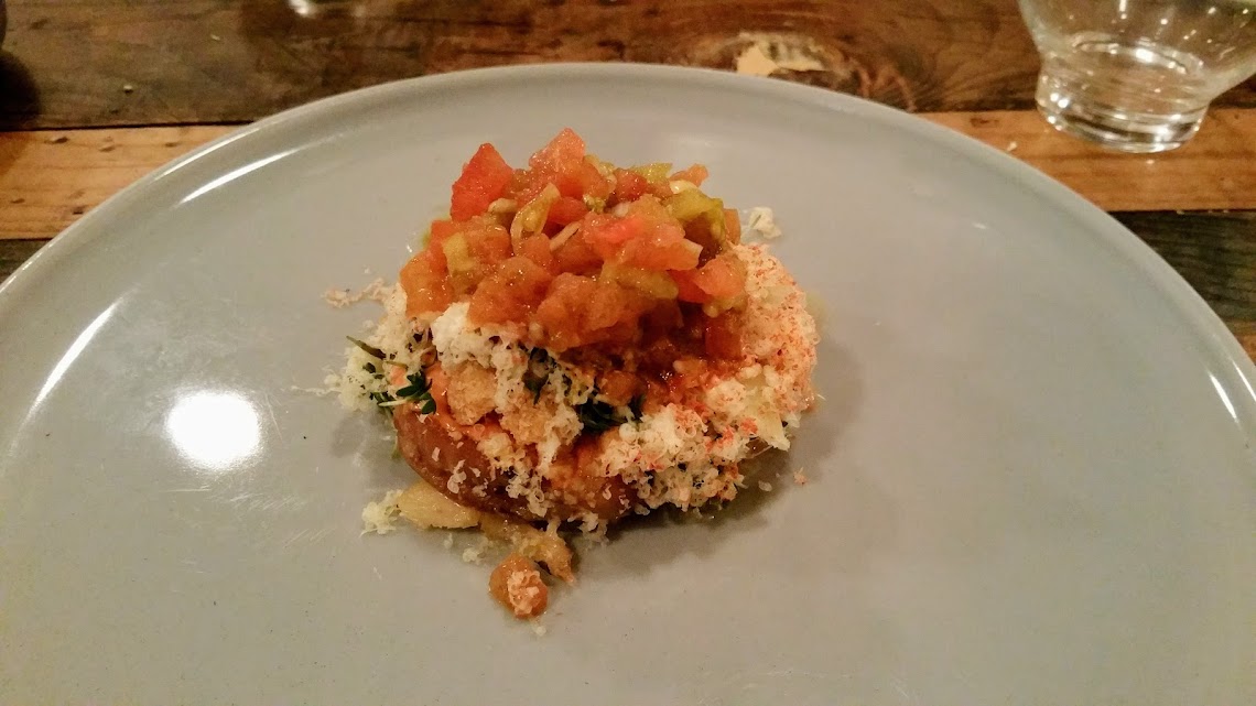 To start, we had this lovely amuse bouche platter - squid ink chips, fresh radish, oyster cream, egg yolk topped with fish roe, fresh beans with mussel cream. Wow! This was my favorite of the night and an excellent indicator of the delicate, unique dishes to follow.