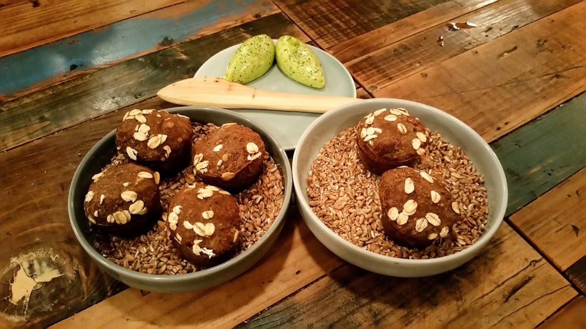 Mini rye and oatmeal rolls with wheatgrass butter ~ the butter was so creamy!